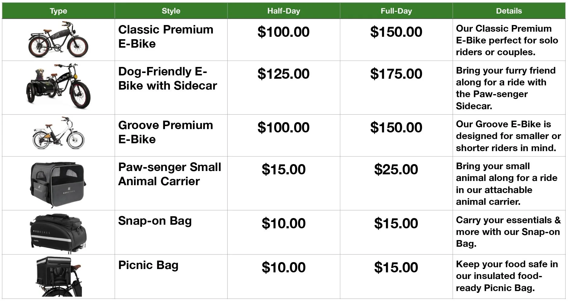 Vine & Vista Tours offers a fleet of premium electric bikes designed for every type of rider—whether you’re exploring solo, with a partner, or bringing your dog along for an adventure.